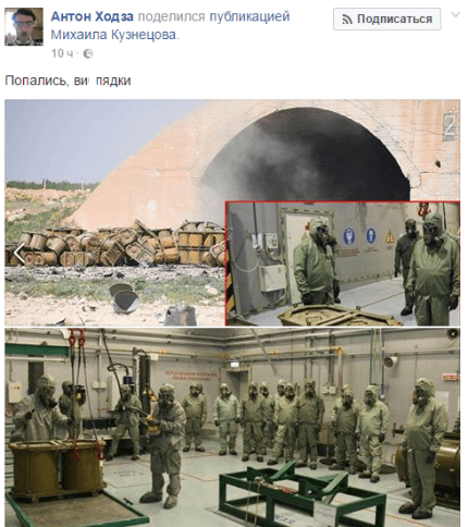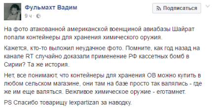 "В кадр российского репортера РИА Новости Михаила Воскресенского попали блоки к контейнерам малогабаритных грузов (КМГУ), которые могут быть как кассетными осколочно-фугасными, так и химическими боеприпасами БКФ-П. В каждой бомбе БКФ-П помещено 12 кассетных элементов с отравляющим веществом зоман (Р-55). Снимки сделаны на авиабазе Шайрат, после нанесенного американцами ракетного удара. Аналогичные контейнеры можно наблюдать на фотографиях процесса уничтожения химического оружия российскими военными на объекте по хранению и уничтожению химического оружия в городе Почеп Брянской области", - говорится в материале.