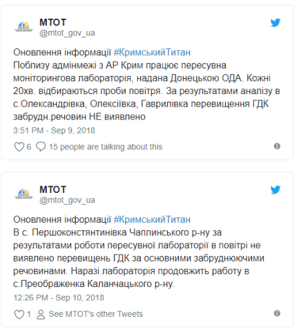 Согласно первым результатам проверки передвижной лаборатории, которая работает вблизи админграницы с оккупированным Крымом, превышение предельно допустимых концентраций загрязняющих веществ в воздухе выявлено не было.