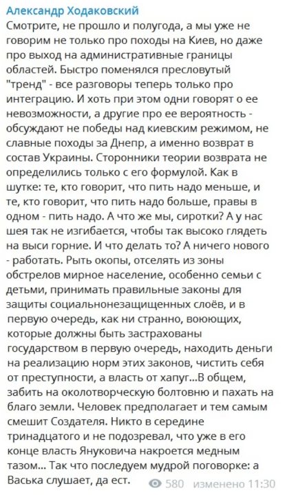 "Мы уже не говорим ни про походы на Киев, ни даже о выходе на административные границы областей. Быстро изменился пресловутый "тренд" – все разговоры теперь только об интеграции. Как в шутке: те, кто говорит, что пить надо меньше, и те, кто говорит, что пить надо больше, правы в одном – пить надо" – написал Ходаковский.