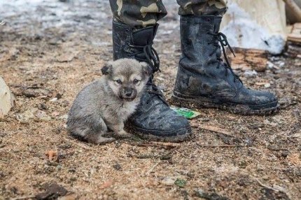 Снимок, на котором щенок прижимается к ноге бойца, набрал более тысячи лайков и более 80 репостов.
