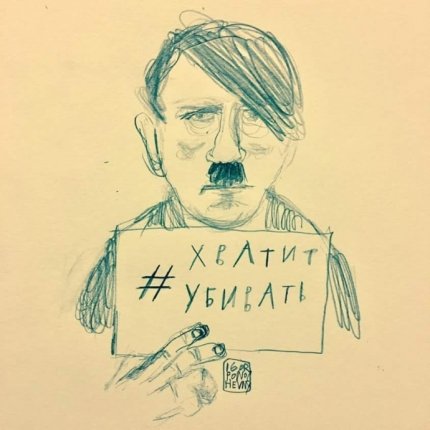 На рисунке изображен лидер нацистской Германии Адольф Гитлер, который держит в руке табличку с призывом "Хватит убивать".