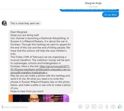 "Когда я спросила у Маргрет, можем ли мы рассказать эту историю, она ответила, что не хотела бы, чтобы ее имя оказалось связано с политикой. Но речь не о политике, а о примере работы российских СМИ, обманывающих не только свою аудиторию, но и тех, с кем работают. Примере, в котором лгут, как бы не и обманывая, но зато на каждом шагу. В ходе разговора Маргрет показала письмо с просьбой которое ей прислали с канала. Цель в нем обозначена так: «Мы хотим призвать прекратить войну и перестать убивать людей. Мы надеемся, что это поможет спасти жизни детей». И ссылка на инфо о флешмобе. На русском языке, разумеется", - говорится в сообщении.