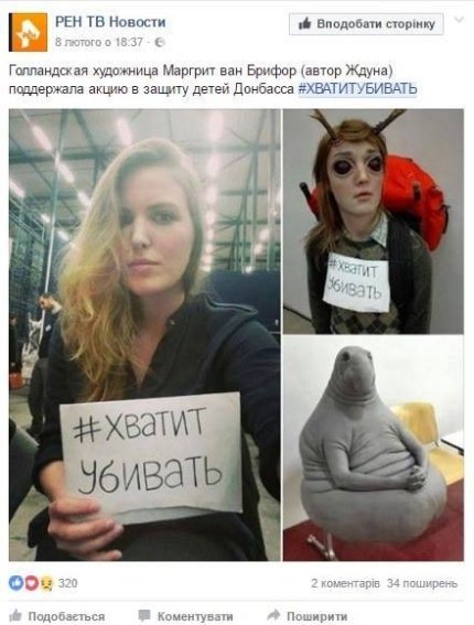 Сообщается, что российский телеканал Рен-ТВ в рамках так называемого «благотворительного марафона» #хватитубивать разместил фотографии голландской художницы Маргрит ван Брифорт, автора скульптуры Ждуна, с соответствующей табличкой в руках. Художница подтвердила, что фото настоящие.