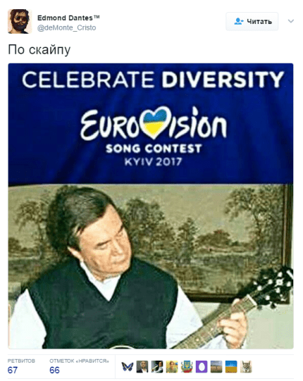 На картинке с подписью "по скайпу", на фоне баннера "Евровидение-2017 в Украине", изображен беглый экс-президент Украины Виктор Янукович, играющий на гитаре.