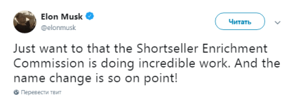 "Просто хотел заметить, что Комиссия по обогащению спекулянтов (Аббревиатуры Shortseller Enrichment Commission и Securities and Exchange Commission совпадают — прим. ред.) делает невероятную работу! И изменение названия — в тему!" — написал Маск.