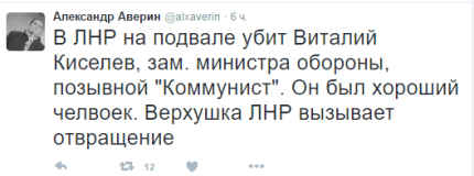 "У ЛНР в подвале убит Виталий Киселев, заместитель "министра обороны", позывной "Коммунист". Он был хорошим человеком", - написал он.