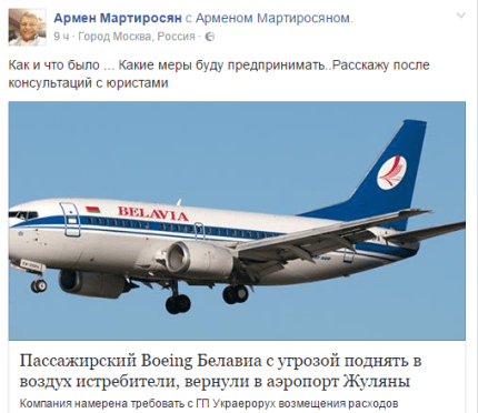 Пассажирский самолет авиакомпании "Белавиа" возвращали в киевский аэропорт "Жуляны" под угрозой поднять истребителей из-за политолога, главы международной общественной организации "Гражданский Cоюз" Армена Мартиросяна, который во время Евромайдана поддерживал действия беглого экс-президента Виктора Януковича.