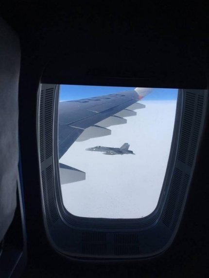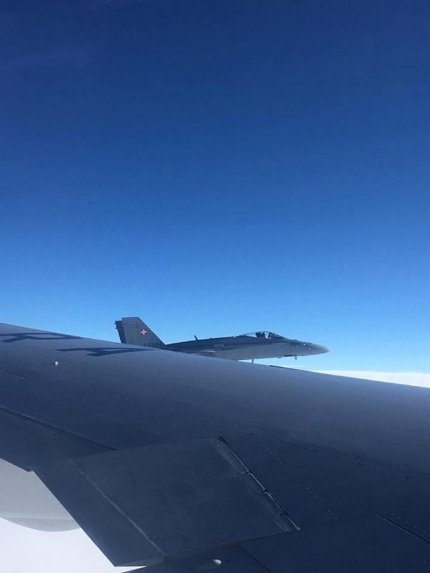 В сети появились новые фото истребителей F-18, которые сопровождали российский Ил-96 с журналистами кремлёвского пула на борту в воздушном пространстве Швейцарии.