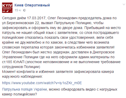 "Прибывший на место патруль не нашел общий язык с заявителем, со слов пострадавшего полицейские отказались показать свои удостоверения, вели себя крайне не дружелюбно и по хамски, в следствии чего возникла словесная перепалка которая закончилась избиением заявителя!" – говорится в сообщении.