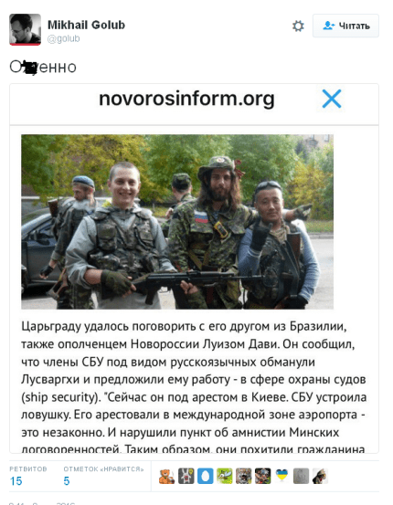 В сепаратистских группах в социальных сетях появилась информация о том, что наемнику из Бразилии, Луизу Дави, якобы предложили работу в сфере охраны кораблей, выманили с неподконтрольной территории и задержали в международной зоне аэропорта «Борисполь».