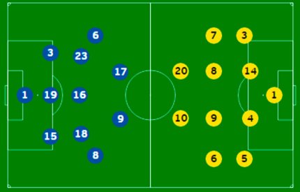 Италия: 1. Буффон (C) - 3. Кьеллини, 19. Бонуччи, 15. Бардзальи - 6. Кандрева, 23. Джаккерини, 16. Де Росси, 18. Пароло, 8. Флоренци - 17. Эдер, 9. Пелле