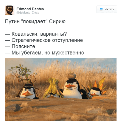 Twitter-сообщество МИД Роисси пишет: "Надеемся, российским военным, спешно сбегающим из Сирии, разрешили взять с собой по паре килограммов турецких помидоров".