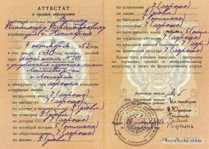Среди оценок в аттестате указаны тройки по геометрии, алгебре и началу анализа, физике, химии, и пятерки по истории, биологии и немецкому.