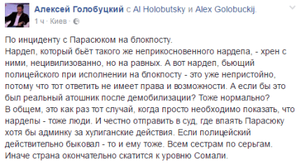 Конфликт начался после того, как полиция хотела провести проверку автомобиля с 8 гражданами в военной форме, у которых было обнаружено оружие. В ходе потасовки депутат начал угрожать и ударил полицейского, требуя от него покинуть блокпост активистов.