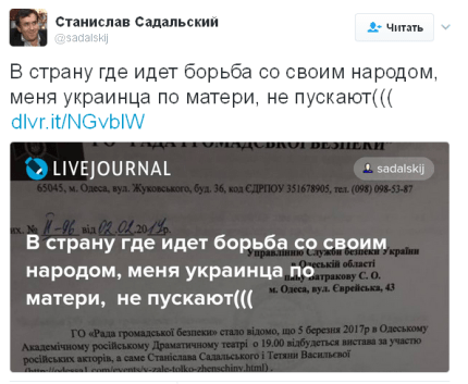 "В страну, где идет борьба со своим народом, меня, украинца по матери, не пускают", — заявил Садальский.