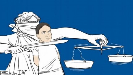 На карикатуре художник изобразил Савченко в руках российской Фемиды, которая держит меч у горла украинской летчицы.