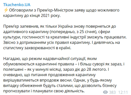 "Как только Украина снова вернется к адаптивному карантина (предварительно, с 25 января), сферы культуры, гостеприимства и креативные индустрии смогут работать. Конечно с соблюдением всех правил карантина. И с учетом статистики заболеваемости в стране", - сообщил Ткаченко.