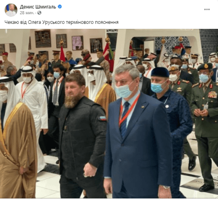 Украинское правительство всколыхнул очередной резонансный скандал. Его спровоцировало фото, на котором рядом изображены министр стратегических отраслей экономики Олег Уруский и глава Чечни Рамзан Кадыров. Снимок, предположительно был сделан на военной выставке IDEX 2021 в Абу-Даби, которую накануне посетил Уруский. Пока неизвестна подлинность снимка, не исключено, что это фотошоп. Но на него мгновенно отреагировал глава Кабмина Денис Шмыгаль, который опубликовал фото Уруского и Кадырова в Facebook и потребовал немедленных объяснений от украинского министра, передает ONLINE.UA.