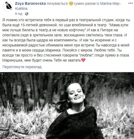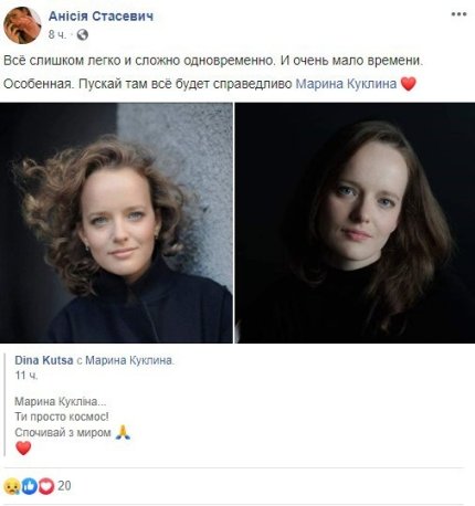 "Как хочется, чтобы это было неправдой ...Излучающая доброту и свет Мариночка. Влюбляющая в себя сразу и навсегда. Прекрасная Мама, заботливая жена , чуткий и чувствующий человек. Ее можно было легко ранить, но она никогда не жаловалась, всегда благодарна, всегда с обезоруживающей улыбкой. Мариночка, ты навсегда в сердце. Как несправедливо рано ...", "Такая светлая, как солнечный лучик и весенний ветерок... как же так?Так мы и не успели посмотреть "Полианну", "Собаку"... так не должно происходить...Светлая память и сил близким...", - скорбят по Марине Куклиной ее коллеги.