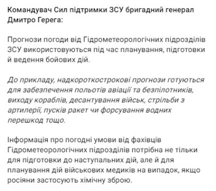 Командующий Сил поддержки ВСУ, бригадный генерал Дмитрий Герега подтвердил, что Вооруженные силы Украины действительно используют прогнозы погоды от своих гидрометеорологических подразделений при планировании, подготовке и ведении боевых действий. По его словам, прогнозы погоды очень помогли нашим бойцам во время контрнаступления в Харьковской и Херсонской областях.