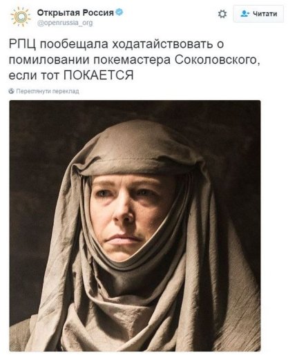 РПЦ готова ходатайствовать о помиловании блогера Руслана Соколовского, которого арестовали за ловлю покемонов в Храме-на-Крови в Екатеринбурге, если он «раскается в совершенном кощунстве тем же открытым и публичным способом, каким совершил оскорбительное деяние», что насмешило сеть.