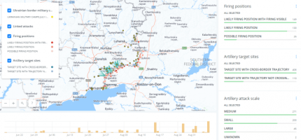 По данным Bellingcat, российская артиллерия обстреливала территорию Украины не менее чем 149 раз — на огневых позициях заметны следы от выстрелов, которые оставляет артиллерия. 17 точек находятся на территории Украины: во всех случаях исследователям удалось обнаружить следы техники от границы с Россией.