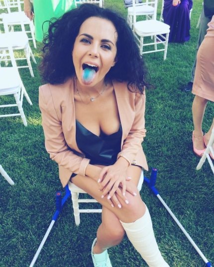 Украинская певица Настя Каменских, которая недавно сломала ногу в результате неудачного прыжка с парашютом, пришла на свадьбу своей подруги на костылях.