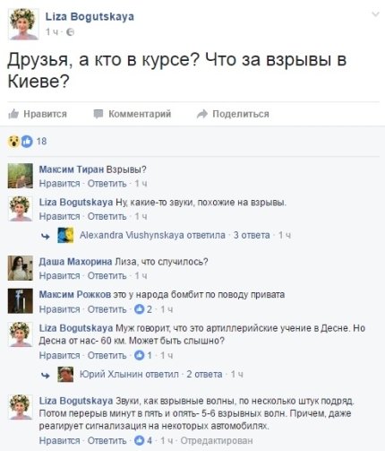 Отвечая на просьбу прокомментировать посты киевлян в соцсетях, обеспокоенных звуками взрывов, глава пресс-службы киевской полиции Оксана Блищик сказала изданию « Обозреватель »: "Перезвоните сначала в Госслужбу по чрезвычайным ситуациям, у нас еще нет информации".