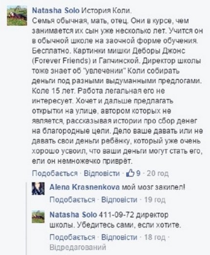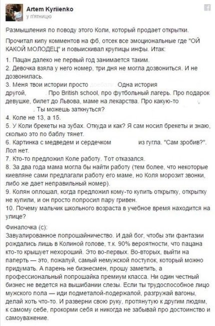 Ранее 13-летний школьник Николай рассказывал корреспондентам о том, что продажей открыток хочет заработать на обучение в British International School, что вызвало бурную реакцию среди киевлян.