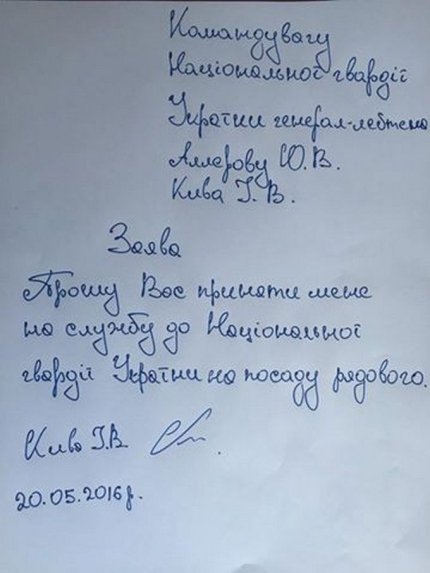 обнародовал заявление, в котором просит командующего Национальной гвардией Юрия Аллерова принять его на службу.