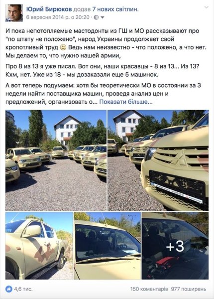 Отдельно Бирюков добавил, что «прилагая нечеловеческие усилия, я заставил-таки не только поставить машины на учет (дабы никто потом никуда на OLX (онлайн-аукцион - Ред.) не них не уехал), но еще и ввести в штат!».