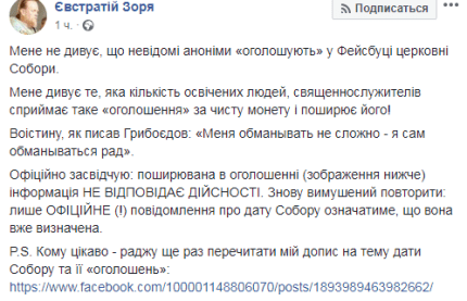 На своей странице в соцсети представитель УПЦ КП подчеркнул, что "объявление" про проведение 22 ноября Объединительного Собора в Украине является фейком. Архиепископ Евстратий подчеркнул, что только официальное сообщение о дате проведения Собора будет означать, что она уже определена.