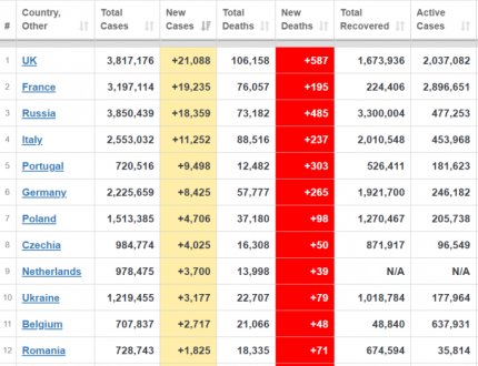 Количество больных коронавирусом в мире также снижается - по состоянию на 1 февраля заболели 103,5 млн человек. За минувшие сутки в мире диагностировали почти 395 тысяч новых случаев. Больше количество больных растет в США, Бразилии, Великобритании, Франции и России. Украина в мировой статистике по ежедневному приросту больных находится на 26 месте, среди стран Европы - на 10 месте. На сегодняшний день почти 26 млн человек продолжают болеть, умерли от осложнений, вызванных COVID-19, более 2,237 млн человек, вылечились - 75 млн пациентов.