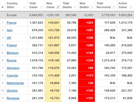 Количество больных коронавирусом в мире также стремительно растет — по состоянию на 1 ноября заболели уже почти 46,5 млн человек. За последние сутки в мире диагностировали более 475 тысяч новых случаев. Больше количество больных растет в США, Индии, Франции, Италии, Великобритании, Польше, Бельгии и России. Украина в мировой статистике по ежедневному приросту больных находится на 15 месте, среди стран Европы - на 10 месте. На сегодняшний день почти 11,7 млн человек продолжают болеть, умерли от осложнений, вызванных COVID-19, более 1,2 млн людей, вылечились – почти 33,5 млн пациентов.