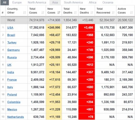 Что важно понимать, за прошедшие сутки в мире было подтверждено рекордное количество случаев коронавируса, почти 715 тыс, и рекордное количество смертей - 13 446. Традиционное досадную первенство в рейтинге держат США - 225 тыс случаев заболевания и 3486 жертв за сутки. Бразилия и Турция снова заняли 2 и 3 место среди других стран мира по суточной заболеваемости. Более 25 тыс больных зафиксировали в Великобритании, России и Германии. Наша страна оказалась на 15 позиции по состоянию на 17 декабря по количеству подтвержденных больных и на 11 - по числу летальных исходов.