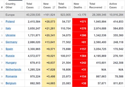 За минувшие сутки в мире заболели коронавирусом 545,5 тысяч человек. Больше всего количество больных растет в Индии, США, Турции, Бразилии, Польше и Италии. Украина в мировой статистике по ежедневному приросту больных находится на 7 месте, среди стран Европы — на 3 месте.
