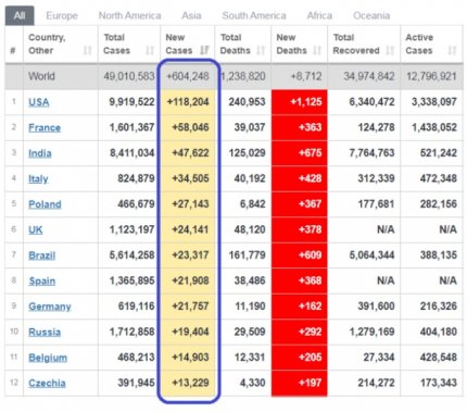 Стоит обратить внимание на то, что 5 ноября в мире за сутки обнаружили рекордное количество случаев заражения коронавирусом - 604 248 (рекордные 573 тыс заражений COVID-19 диагностировали 29 октября). В частности, 310 707 новых больных зафиксировано в странах Европы. В Украине за минувшие сутки диагностировали рекордные 9850 заражений. В странах Европы лидерами антирейтинга по количеству новых случаев COVID-19 стали Франция, Италия, Польша, Великобритания и Украина, которая занимает 11-е место. В соответствующем мировом антирейтинге Украина находится на 16-м месте. Лидерами регионального антирейтинга из общего числа выявленных заражений является Франция, Испания, Великобритания, Украина занимает 9-м месте. В соответствующем мировом антирейтинге Украина уже на 20-м месте.