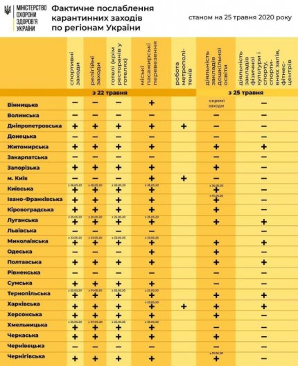 В Украине с 22 мая начался второй этап ослабления карантина. Во многих регионах позволили спортивные мероприятия без зрителей, религиозные мероприятия, работу гостиниц, но без ресторанов и спа-зон, регулярные и нерегулярные пассажирские перевозки автотранспортом - на уровне городов, пригородных зон, областей, работу детских садов. Однако ослаблять карантин пока не будут в Черновицкой, Ровенской, Львовской областях, а также в Закарпатье и Волыни - там ограничения продлили до 22 июня.