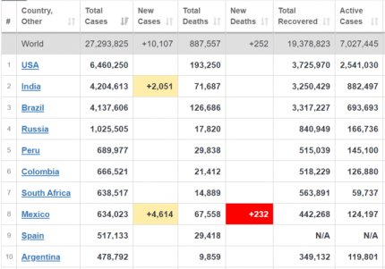 Количество больных коронавирусом в мире также стремительно растет — по состоянию на 7 сентября заболели уже более 27,2 млн человек. За последние сутки в мире диагностировали более 231 тысячи новых случаев. Больше количество больных растет в США, Бразилии и Индии. В России, которая находится на четвертом месте в мире по заболеваемости COVID-19, на сегодняшний день число заболевших превышает 1,025 млн случаев. Украина в мировой статистике по заболеваемости коронавирусом находится уже на 24 месте, среди стран Европы - на 15 месте.