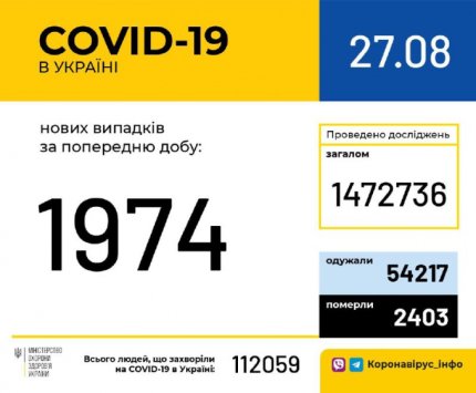 Ситуация с пандемией коронавируса в Украине стремительно ухудшается - в четверг, 27 августа, зафиксировали 1974 новых случая заражения. Общее количество больных COVID-19 насчитывает уже 112 059 человек, из них 2403 человека умерли из-за осложнений, спровоцированных коронавирусной болезнью. Уже 54217 украинцев смогли победить коронавирус - повторное лабораторное исследование не выявило COVID-19 в их организме. Об этом сообщает ONLINE.UA со ссылкой на официальные данные Министерства здравоохранения и СНБО.