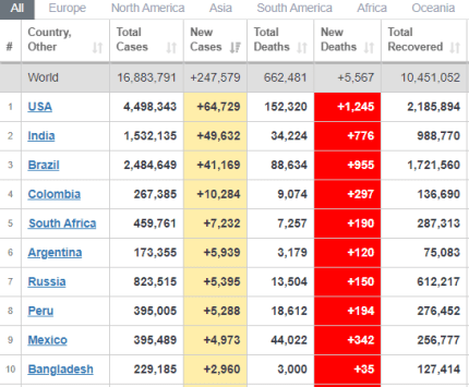 Стоит обратить внимание на то, что 28 июля в мире зафиксировали 247 тыс случаев заболевания коронавирусом. Больше всего новых случаев зафиксировали в США - 64,7 тыс. В Индии заболели около 50 тыс, в Бразилии - более 41 тыс, в Колумбии - более 10 тыс. Жертвами коронавируса в этот день стали 5567 больных. Всего за время пандемии в мире обнаружили 16 млн 883 тыс случаев заболевания. От осложнения болезни умерли 662 тыс человек, вылечились - 10 млн 446 тыс.