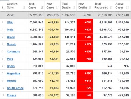 Количество больных коронавирусом в мире также стремительно растет — по состоянию на 4 октября заболели уже более 35 млн человек. За последние сутки в мире диагностировали 295 тысяч новых случаев. Больше количество больных растет в Индии, Бразилии и США. Украина в мировой статистике по заболеваемости коронавирусом находится уже на 25 месте, среди стран Европы - на 7 месте. По количеству умерших в сутки Украина 10-я в мировой динамике и 2-я в европейской. В Европе за предыдущие сутки самая высокая смертность в России - там умерли 174 человек. На сегодняшний день более 7,9 млн человек продолжают болеть, умерли от осложнений, вызванных COVID-19, более 1,037 млн людей, вылечились – 26,1 млн пациентов.