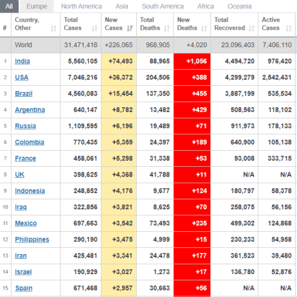 Что важно понимать, по состоянию на 22 сентября от коронавируса выздоровели 23 миллиона 96 тыс больных, активными остаются 7,4 миллиона случаев. Умерли от осложнений заболевания почти 967 тыс человек. За последние сутки подтвердили 226 тыс случаев заражения и зафиксировали 4020 смертей. Четвертая часть летальных случаев за это время пришлась на Индию. "Лидерами" по числу новых больных остаются Индия, США и Бразилия. Украина сейчас находится на 16 позиции среди стран мира по количеству больных за последние сутки.