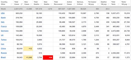 Общее количество больных в мире достигло уже 2 831 915 человек. Более 197 тысяч людей умерли от осложнений, вызванных болезнью. При этом 807 037 людей вылечились от коронавируса. За предыдущие сутки в мире диагностировали более 105 тысяч заражений COVID-19.