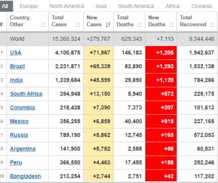 Стоит обратить внимание на то, что за время пандемии было зарегистрировано 15 млн 371 тыс случаев заражения. Летальными оказались 630 тыс. Смогли победить болезнь 9 млн 348 тыс больных. 22 июля коронавирус обнаружили почти у 280 тыс человек - это новый антирекорд. В США зарегистрировали около 72 тыс новых случаев заболевания, в Бразилии - более 65 тыс, в Индии - 45,5 тыс, в Южной Африке - более 13 тыс, в Колумбии - 7,3 тыс. В этот же день умерли 7113 больных. В частности, в Бразилии от осложнений коронавируса погибли 1293 человека, в США - 1205, в Индии - 915, в Южной Африке - 572.