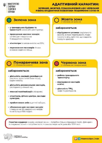 22 июля Кабмин принял решение о продлении адаптивного карантина до 31 августа во избежание достижения пиков заболеваний и перегрузки системы здравоохранения. Что важно понимать, в зависимости от эпидемиологической ситуации все регионы будут разделены на несколько зон: зеленую, желтую, оранжевую и красную по уровню эпидемической опасности распространения COVID-19. При этом критерии для распределения регионов на четыре зоны остаются неизменными. В зависимости от показателей будут приниматься меры по ослаблению или усилению карантина в отдельно определенных регионах.