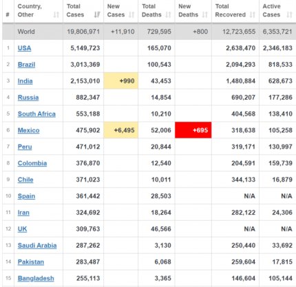 Количество больных коронавирусом в мире также стремительно растет — по состоянию на 9 августа заболели уже более 19,8 млн человек. За последние сутки в мире диагностировали 261 тысячу новых случаев. Больше количество больных растет в США, Бразилии и Индии — там за сутки зафиксировали более чем по 50 тысяч новых случаев заболевания. В России, которая находится на четвертом месте в мире по заболеваемости COVID-19, на сегодняшний день число заболевших превышает 882 тысяч. Украина в мировой статистике по заболеваемости коронавирусом находится на 34 месте.