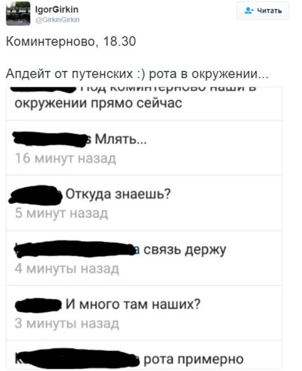 «Коминтерново, 18.30 Апдейт от путенских :) рота в окружении...», - написал IgorGirkin и опубликовал соответствующий скриншот переписки пророссийских боевиков.