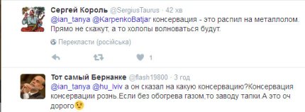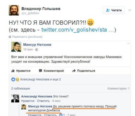 "Нимношка про "внешнее управление" украинскими предприятиями в дыре", - написал блогер под ником Непогана Тетяна, разместив скрин-шот сообщения о введения "консервации" на Коксохимическом заводе в Макеевке.