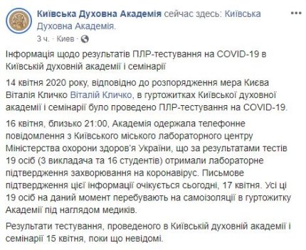 "16 апреля около 21:00 Академия получила телефонное сообщение из Киевского городского лабораторного центра Министерства здравоохранения Украины, по результатам тестов 19 человек (3 преподавателя и 16 студентов) получили лабораторное подтверждение заболевания коронавирусом", - заявили в заведении УПЦ.